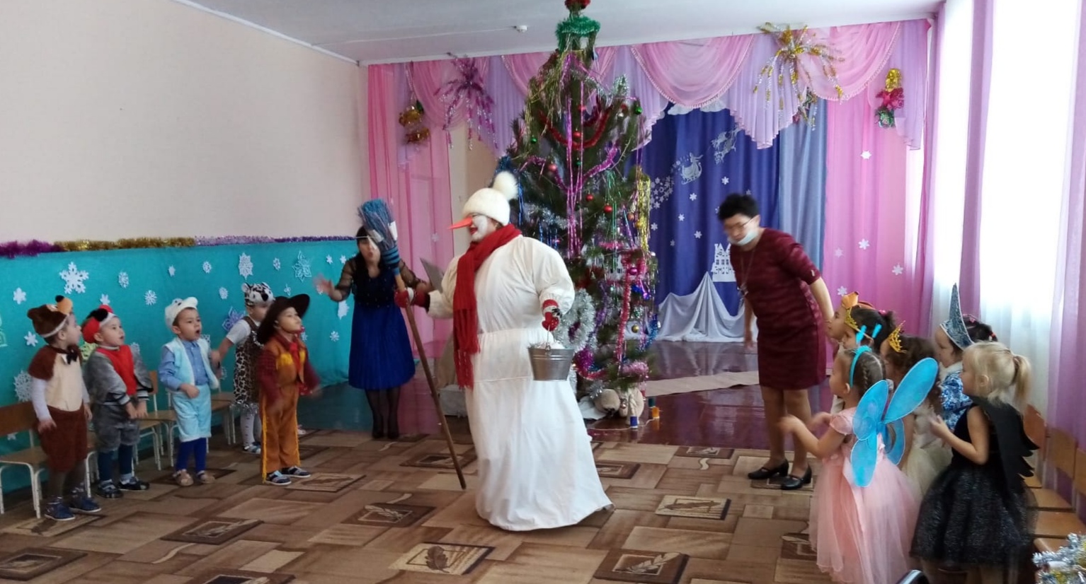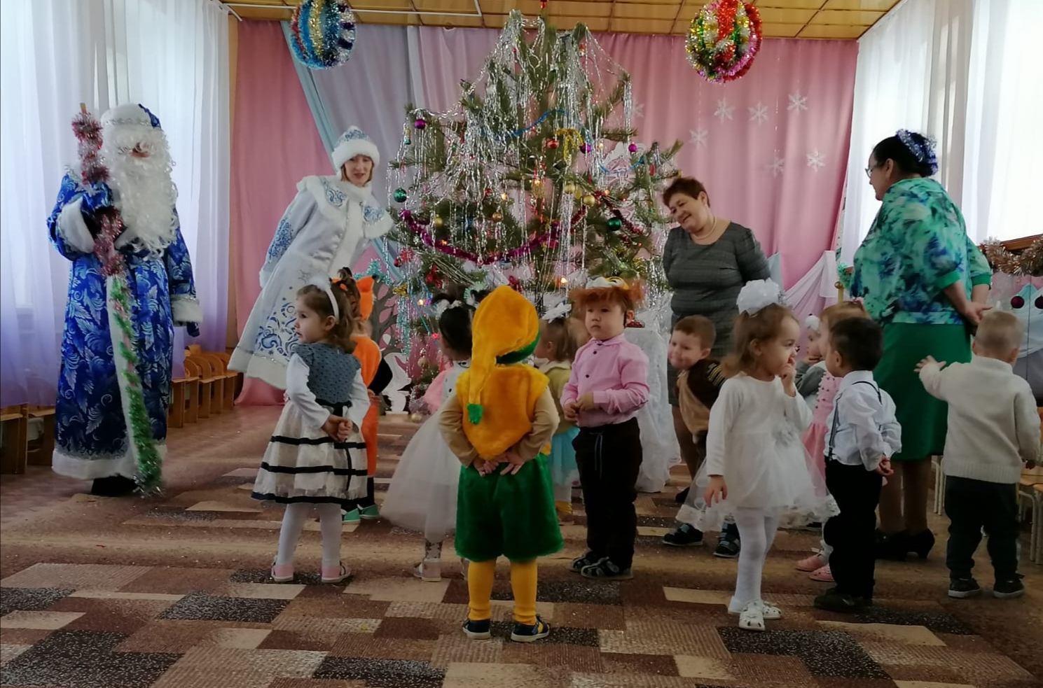 Разноцветные, сверкающие гирлянды и ярко украшенная ёлочка принесли детям ощущение чуда. С самого начала представления сказочные герои увлекали детей в волшебный мир сказки. Дети окунулись в праздничную атмосферу приключений, поучаствовали в интересных конкурсах. С появлением Деда Мороза начался настоящий праздник с песнями и танцами, хороводами вокруг ёлки.