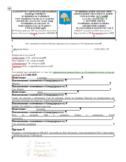 Акт замены блюд