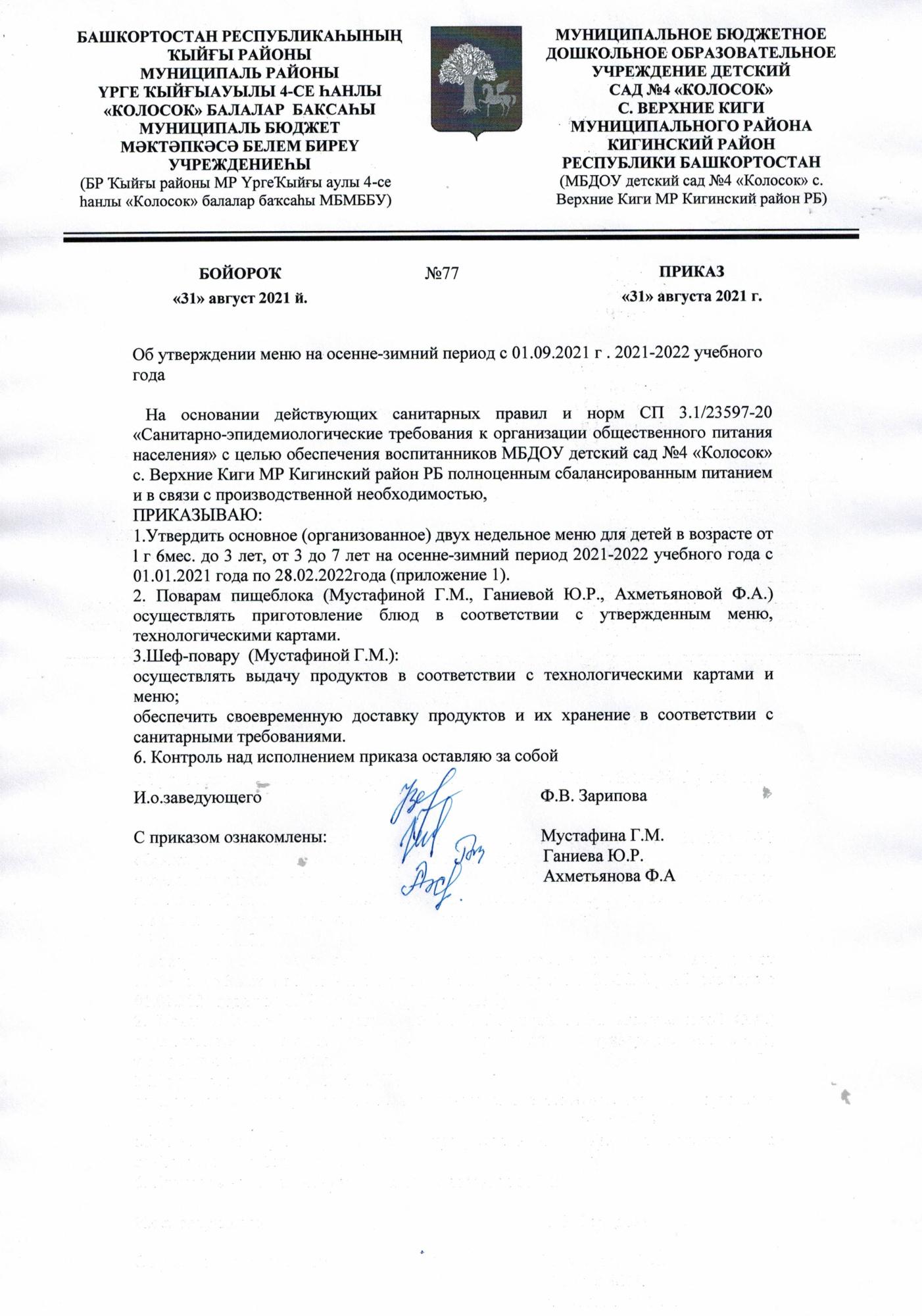 Приказ об утверждении меню на осенне-зимний период 2021-2022 уч.года