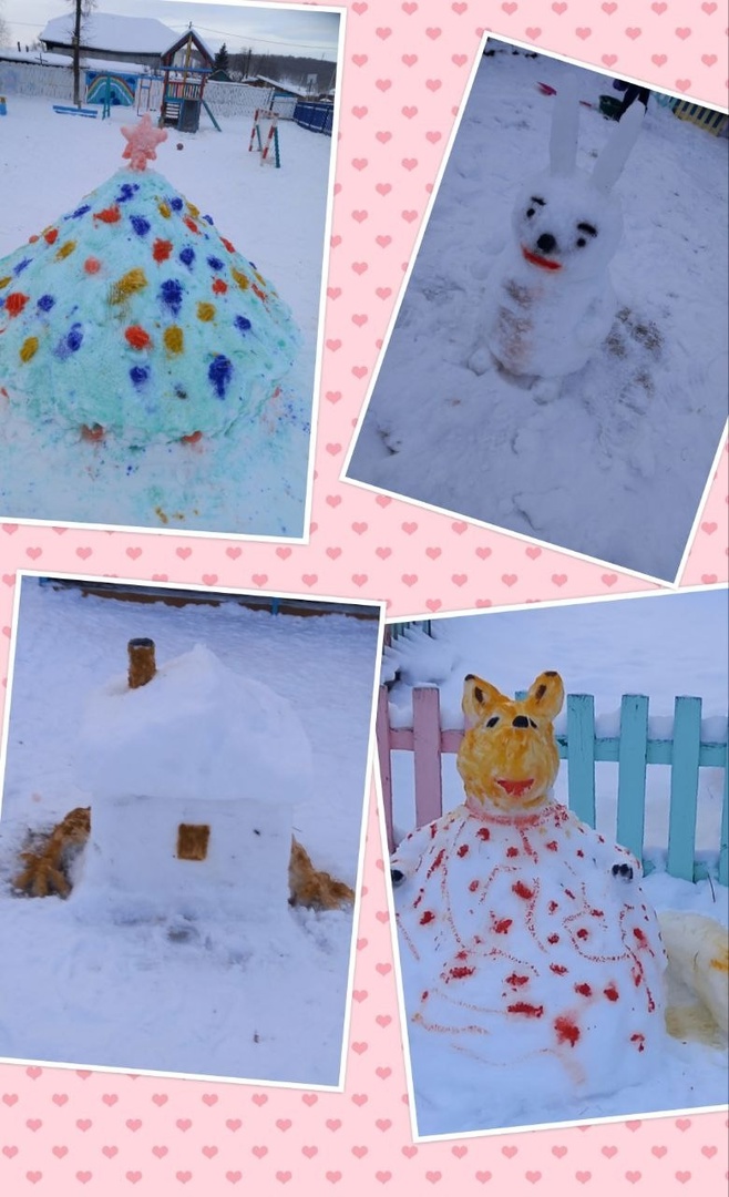 У каждой снежной фигуры свое предназначение. Фигуры получились большими, крепкими и прочными. Постройки разукрашены, от этого они стали еще веселей. Участки стали очень красивыми, преобразились, прогулки проходят с большим интересом.